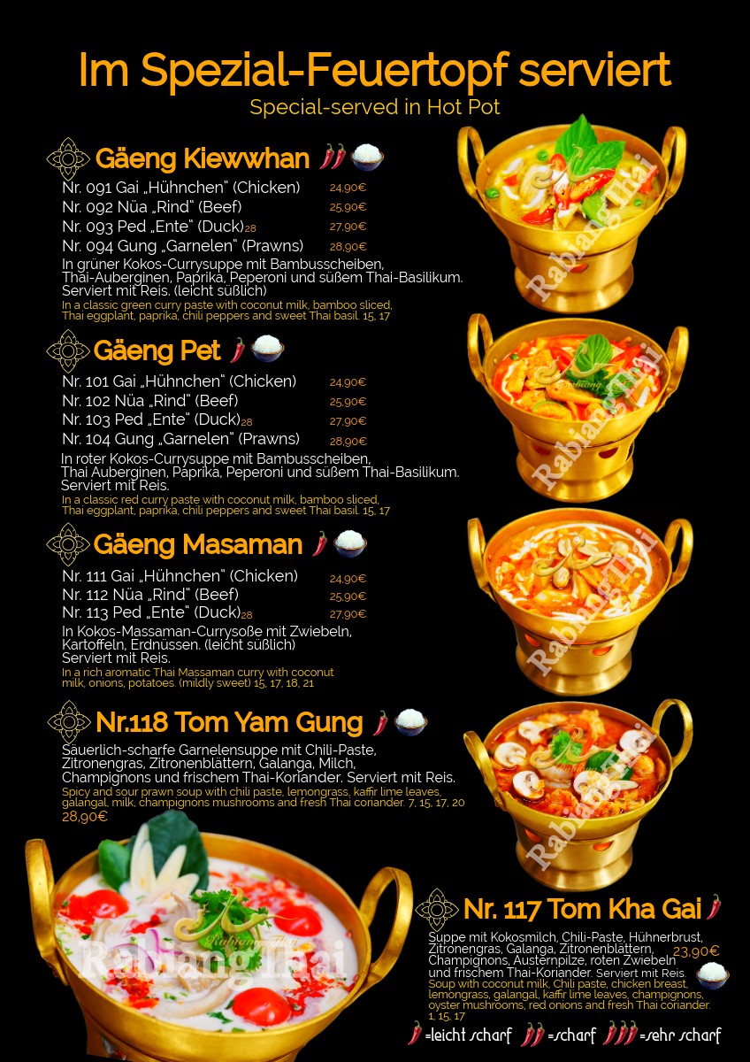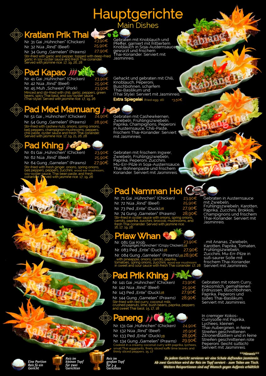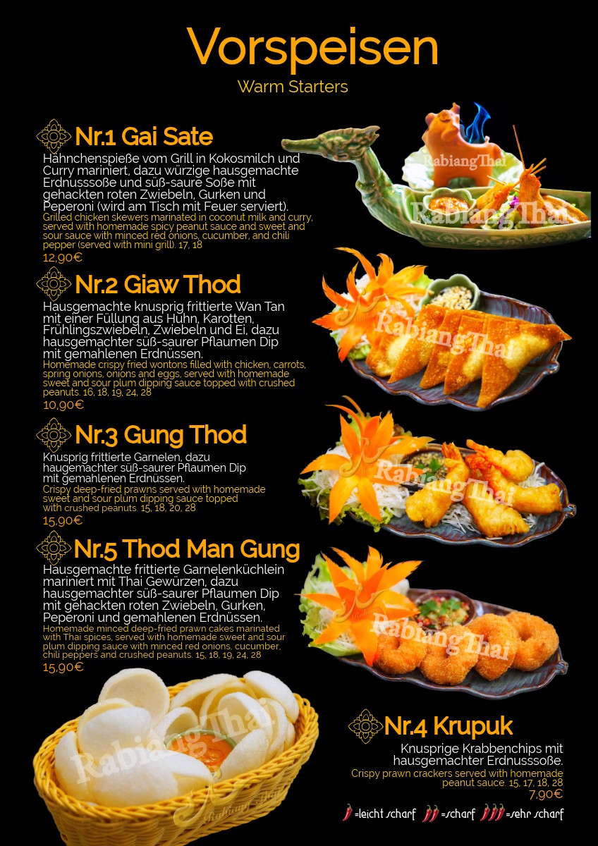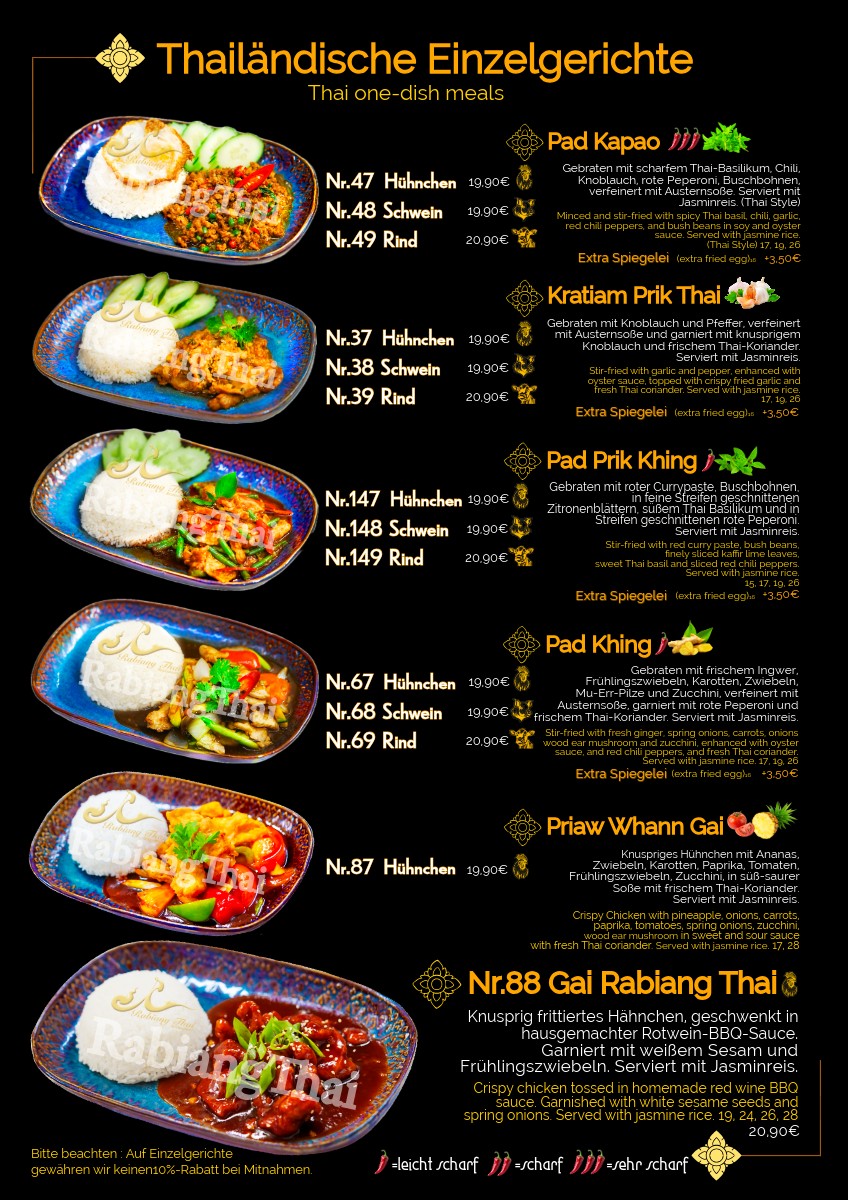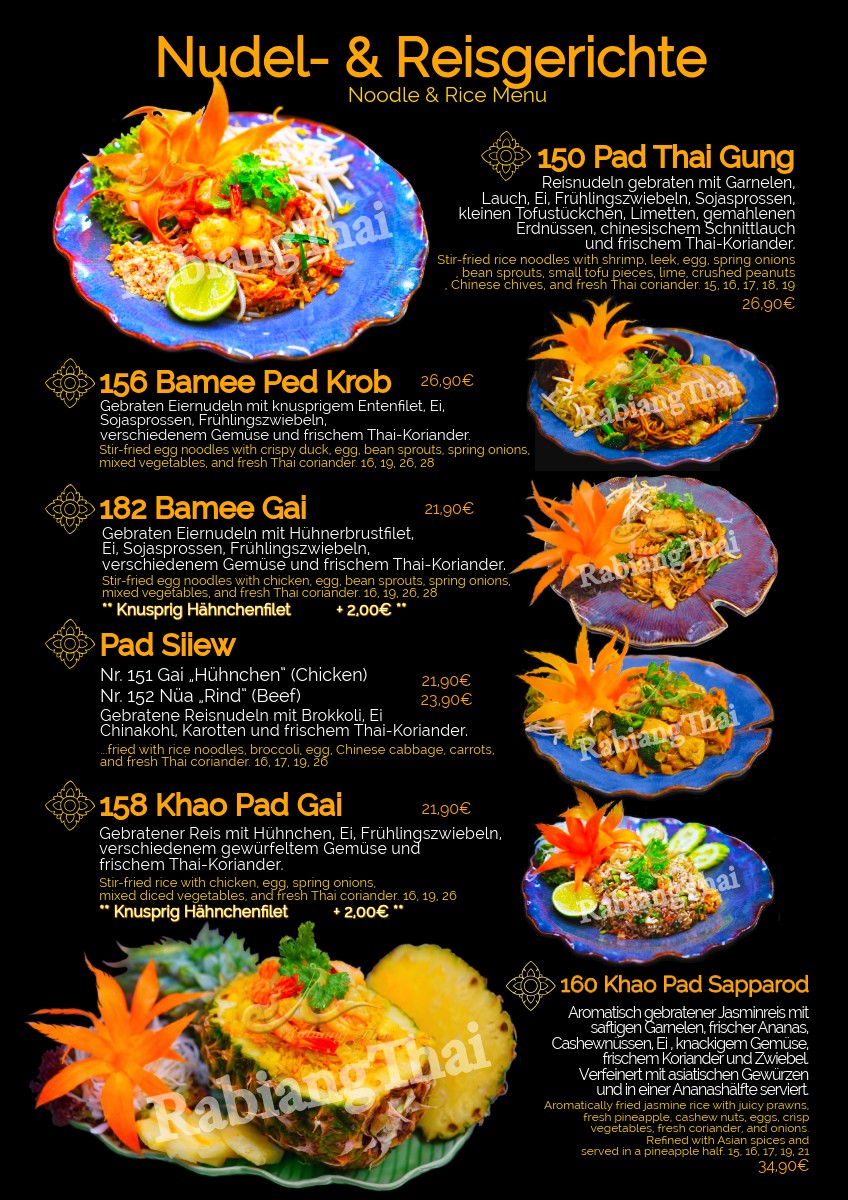 Rabiang Thai ist ein Stück Thailand. Sie müssen nicht 10 Stunden nach Thailand fliegen um authentische Thailändische Küche genießen zu können. Wir kochen wie zu hause, ausschließlich mit frischen Zutaten und nach traditioneller Art. Sie finden bei uns Ihre Lieblings Thai Gerichte, wie z.B.: Pad Thai oder den Feuertopf. Wir haben leichte, kleine oder große Gerichte, mit und ohne Fleisch, oder rein vegetarisch,typisch Thai Food.